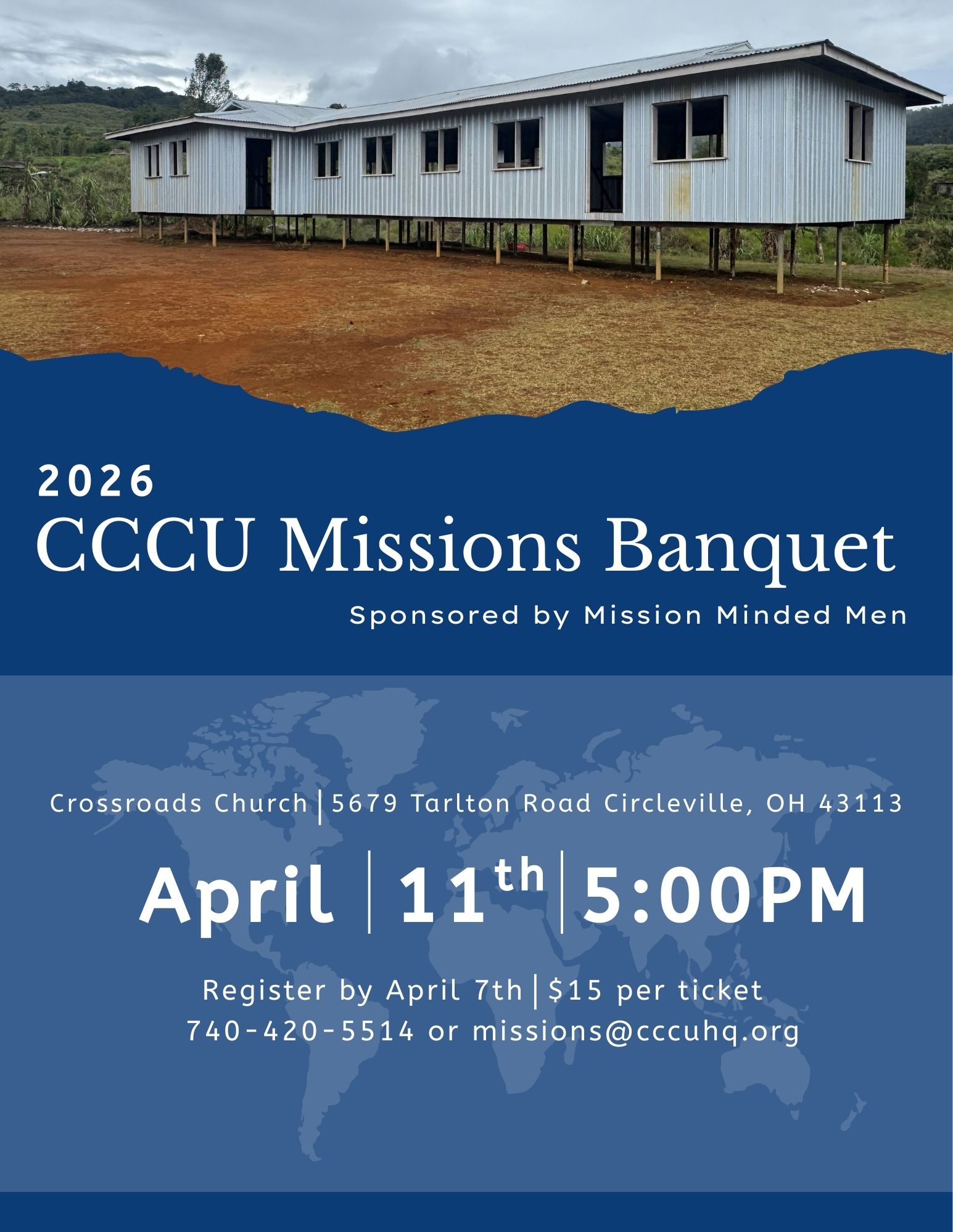 The 2026 CCCU Missions Banquet, sponsored by our Mission Minded Men, will be held on Saturday, April 11th, at 5:00 P.M. at Crossroads CCCU in Circleville, Ohio.